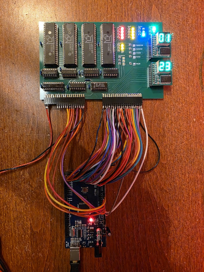 With this I can control almost all lines into the board, and execute an ALU operation. When the “execute” button is pressed the selected values are sent to the Arduino, and that sets the appropriate pins and toggles the clock signals (and latches the flags).