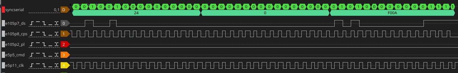 This is hard to debug from just the LA trace, so I made a protocol decoder for Sigrok: syncserial. This decoder decodes the data from the serial data stream so that we can more easily understand what we see. One such trace looks like this: